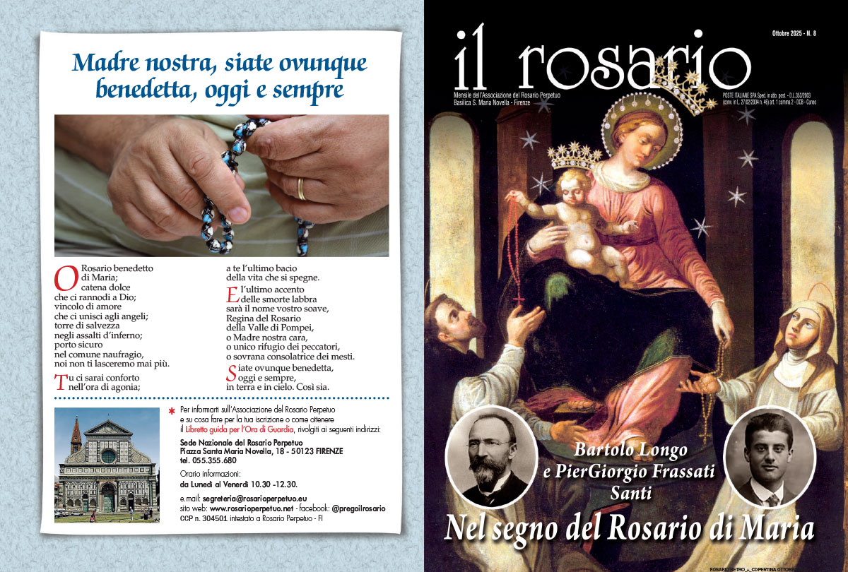 In questo mese del Rosario abbiamo la canonizzazione di Bartolo Longo, dopo aver avuto quella di Piergiorgio Frassati. Tutti e due sono fedeli laici del Terz'Ordine domenicano, entrambi amanti del Rosario e dell'Associazionismo cattolico, tanto che S. Piergiorgio è Patrono delle Confraternite e S. Bartolo Longo è il fondatore del Santuario della Madonna del Rosario a Pompei insieme alle opere annesse. Il Rosario per loro è stato strumento efficace per la propria santifi cazione e per l’apostolato e le opere di carità.