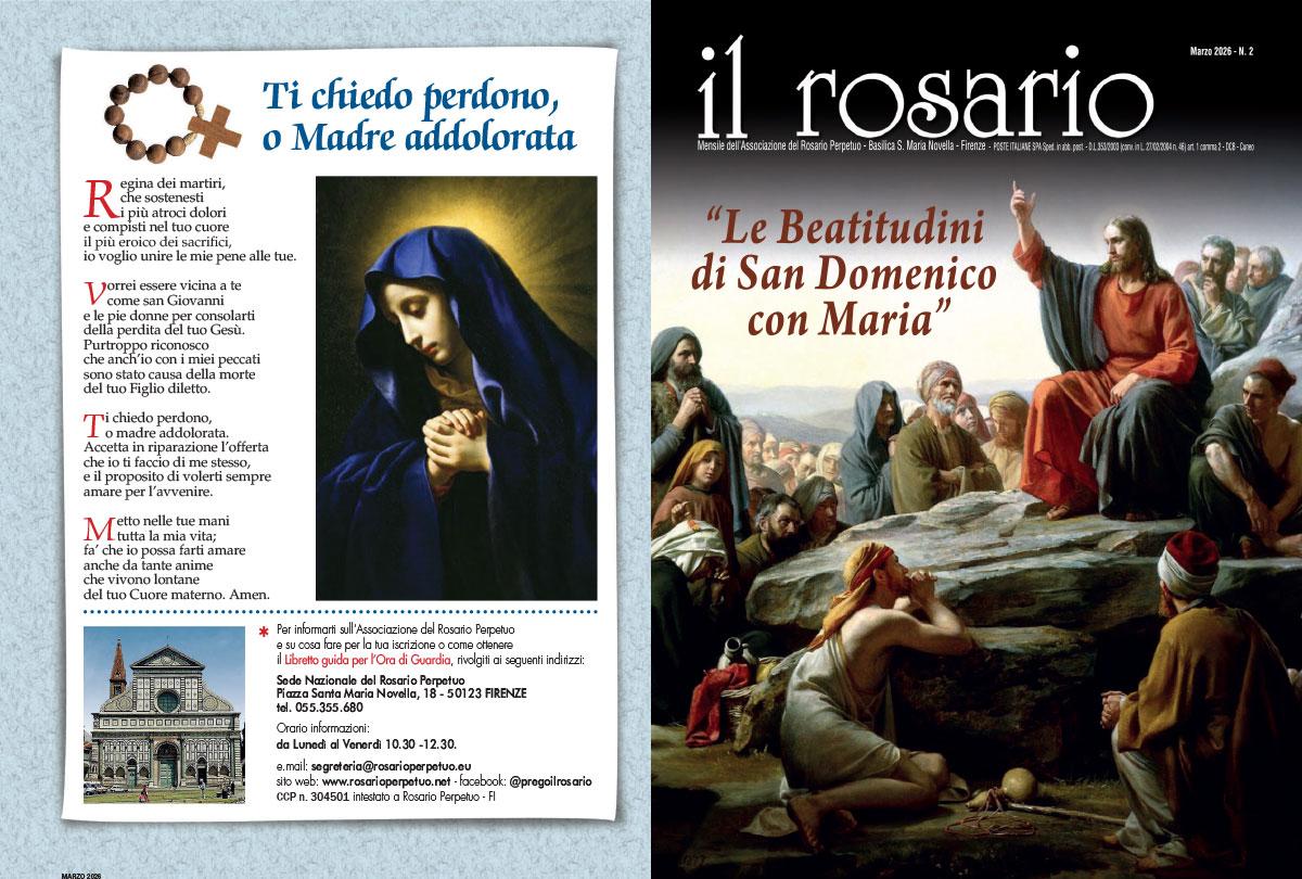 In questo mese incontriamo anche il mistero fondante del Rosario: l’Incarnazione, che viene celebrata il 25 marzo in occasione della festa dell’Annunciazione del Signore. Proprio il 28 marzo 1901 Papa Leone XIII ha benedetto la nostra Associazione, riavviata nell’ottobre 1900 da P. Costanzo Becchi.